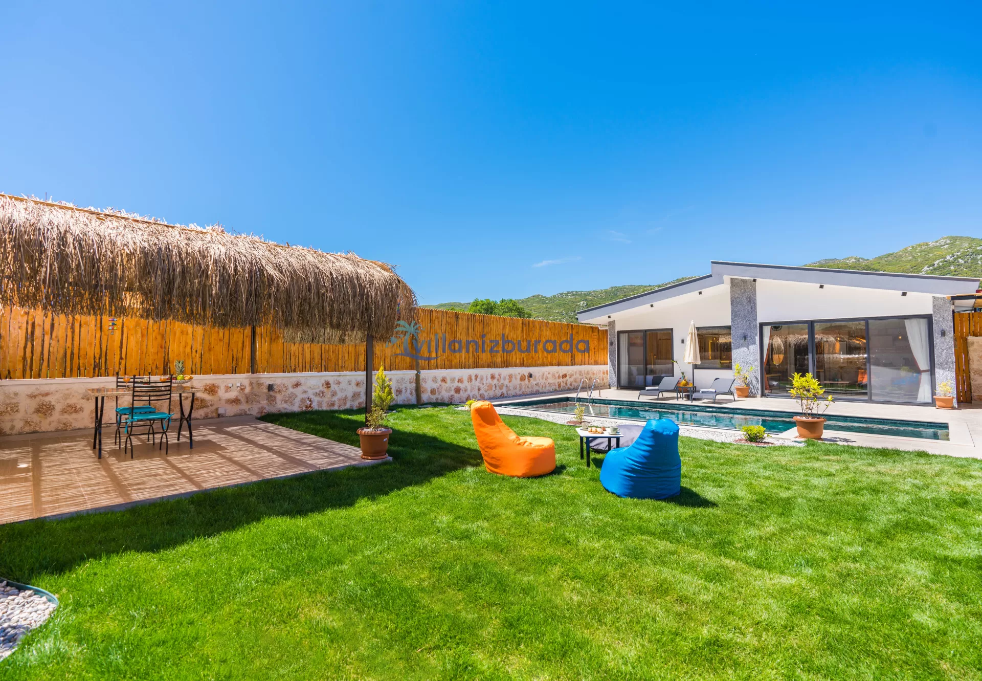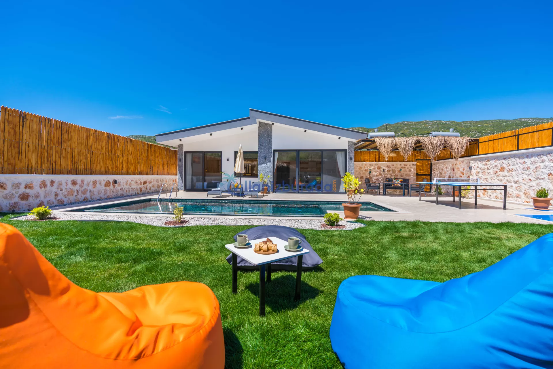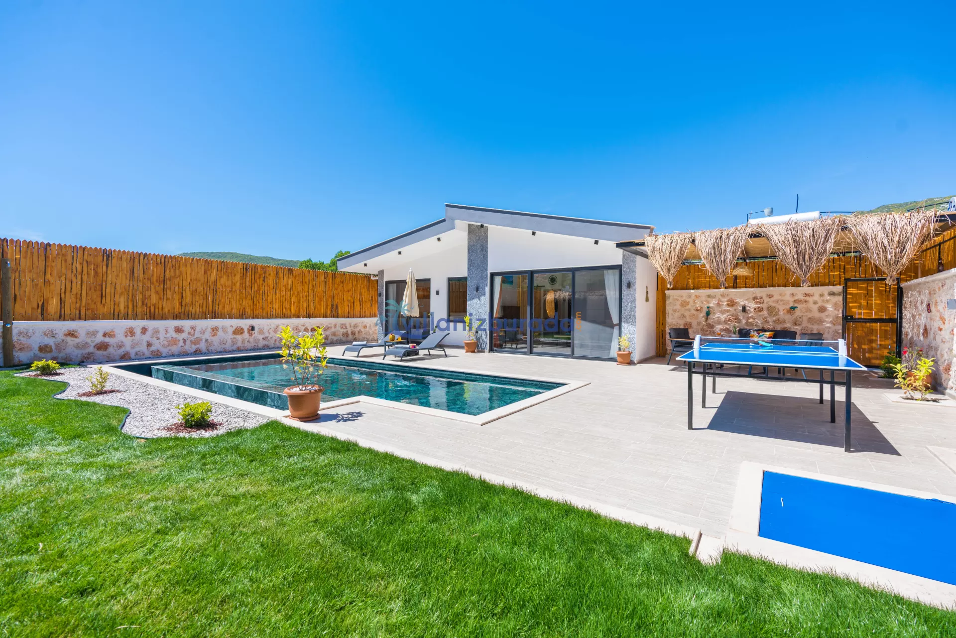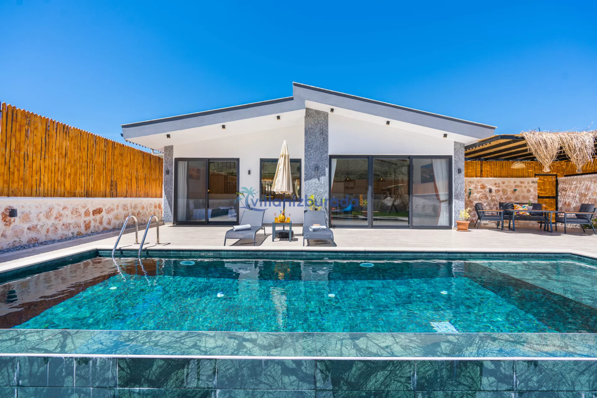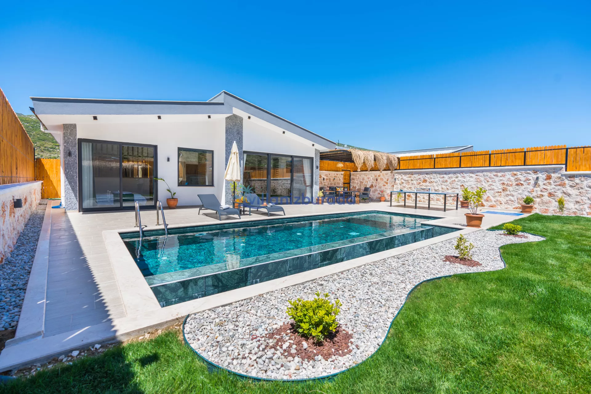 Villa Apollon is a garden villa with a capacity of 2 people, located in Kalkan Sarıbelen. You will be able to feel at home thanks to the modern design of our villa designed for you, our valued guests. Thanks to its large pool terrace and garden area, it has an environment where you can have fun with your loved ones. You will be able to relieve all the tiredness of the year thanks to the private pool and jacuzzi in our villa. For our guests who want to holiday as two couples, there is Villa Daphne next to our villa.
